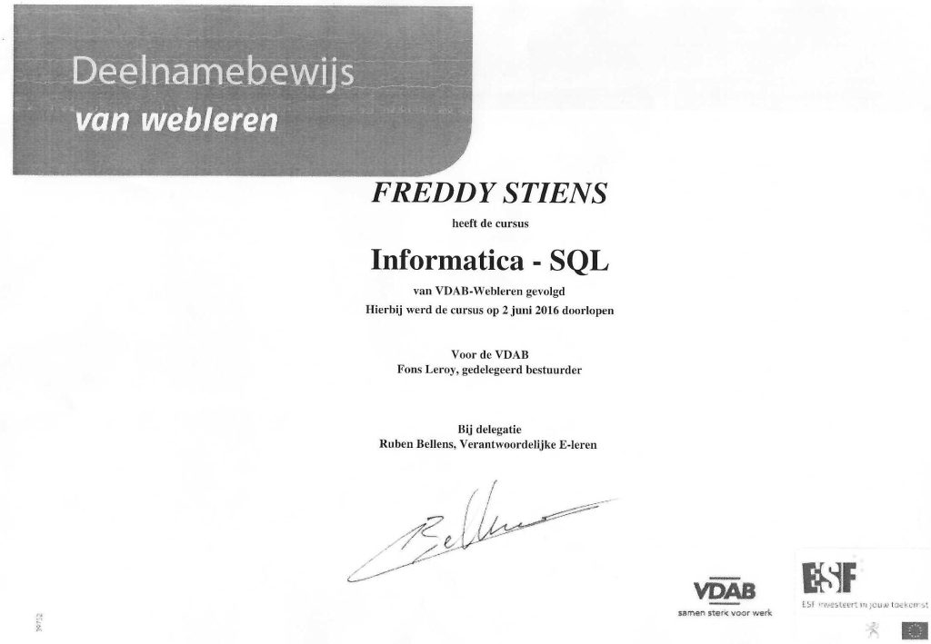 I followed an SQL course via the VDAB Webleren platform, with the goal of strengthening my database fundamentals as an engineer moving deeper into software testing and development. The course focused on core SQL concepts and combined online learning with practical validation by a teacher, which made it more than just a self study module.