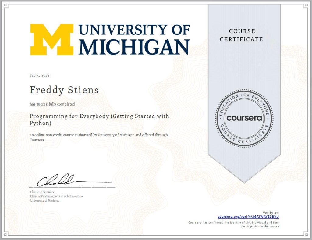 I completed the online course Programming for Everybody Getting Started with Python, offered via Coursera and authorized by the University of Michigan. I approached this course with the goal of building a solid and correct foundation in Python.