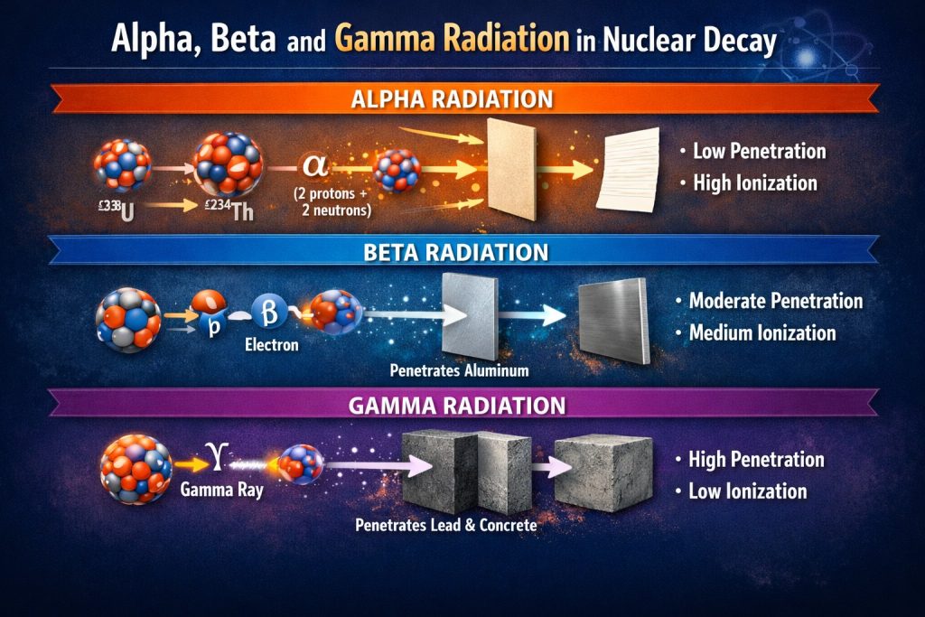 When an unstable atomic nucleus transforms itself into a more stable configuration, the process is known as nuclear decay. During this transformation, energy is released in the form of radiation. The three most common types observed in natural and artificial radioactive processes are alpha radiation, beta radiation, and gamma radiation. Although these forms of radiation often appear together, they are fundamentally different in nature, behavior, and impact on matter. Understanding these differences is essential in physics, medicine, nuclear engineering, and radiation protection.