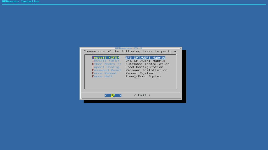 The installer does not start automatically. The actual installation must be explicitly started from the shell by selecting a ZFS or UFS installation. Only after this step is the system copied from the USB stick to internal storage. I have chosen for a ZFS file system.